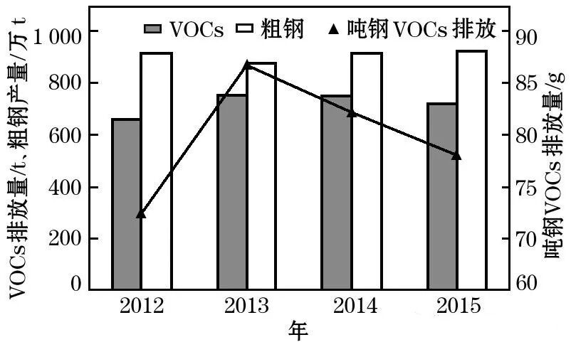 下图依次显示了日本新日铁住金和我国台湾中钢的VOCs排放情况。2015 年,日本新日铁住金的VOCs排放总量为619 t,吨钢VOCs排放约为13.65 g;我国台湾中钢的VOCs 排放总量为720 t,吨钢VOCs排放量约为78.09 g。